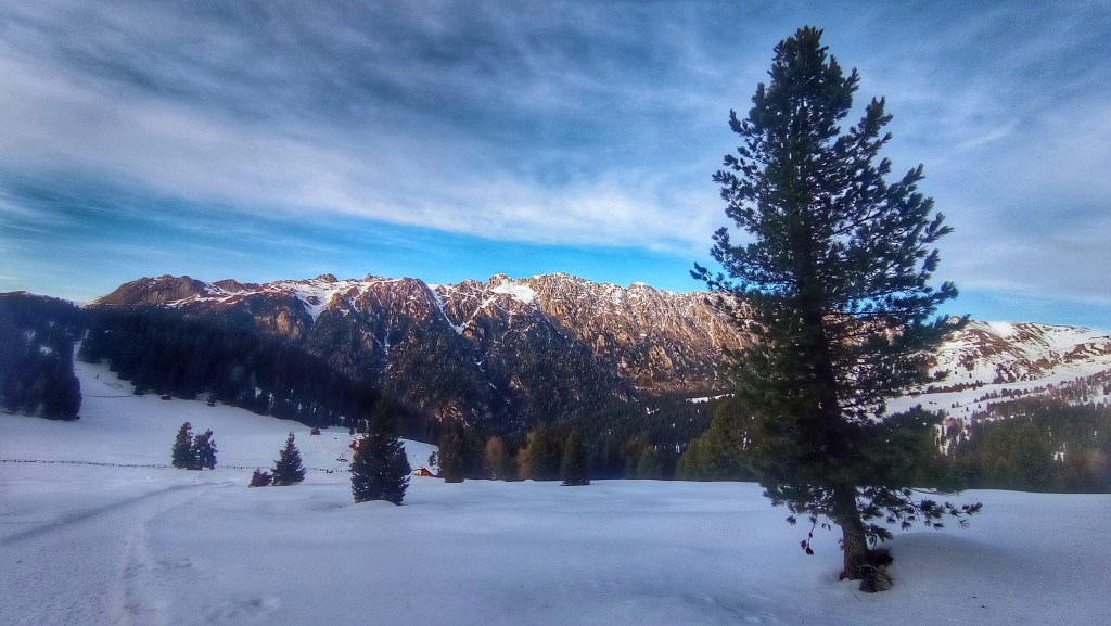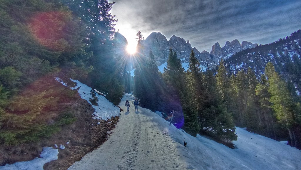 Le mulattiere battute dal gatto delle nevi permettono di accedere alle varie malghe (Geisler, Gampen, Dusler, Glatsch), aperte in stagione con servizio di ristoro, tramite deliziose, comode passeggiate che rendono spesso superfluo l’utilizzo delle ciaspole; comodi i ramponcini per eventuali tratti ghiacciati. Nello scatto, in cammino verso Malga Dusler