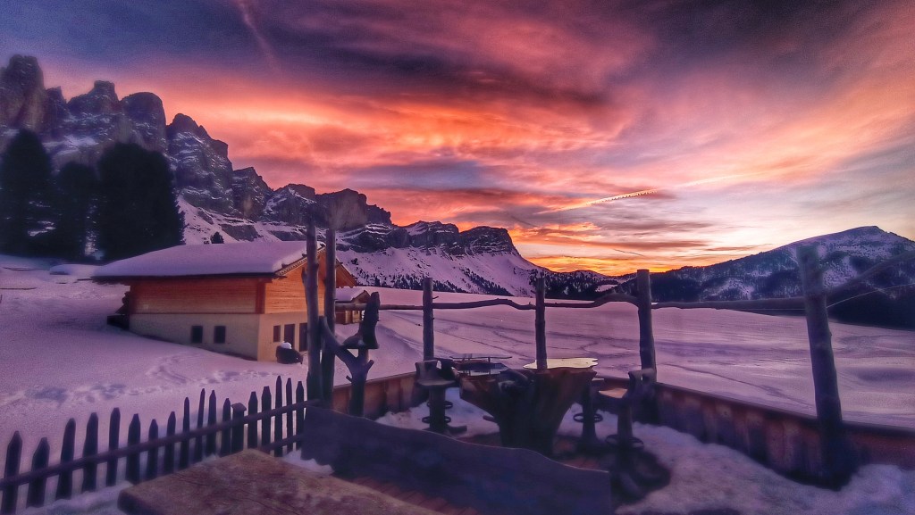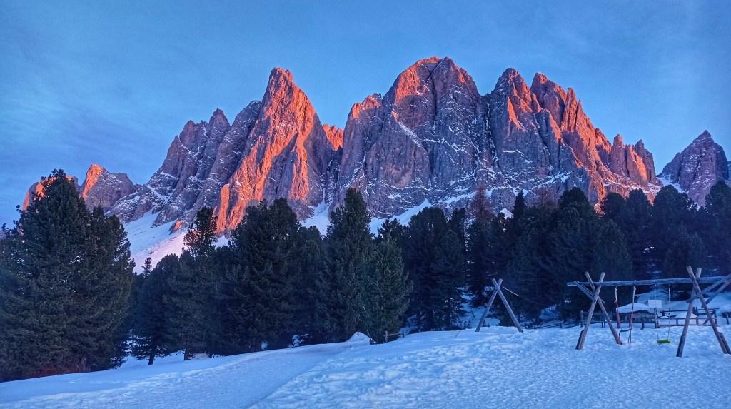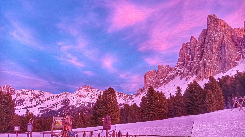17-19 febbraio 2023. Tre giorni di winterwanderung e slittate nell’incanto bianco della Foresta Nera, ai piedi delle magnifiche giogaie dolomitiche delle Odle, nel cuore pulsante del PARCO NATURALE PUEZ-ODLE. Nello scatto l’Enrosadira che fa arrossire d’emozione il Sass Rigais e La Furchetta.