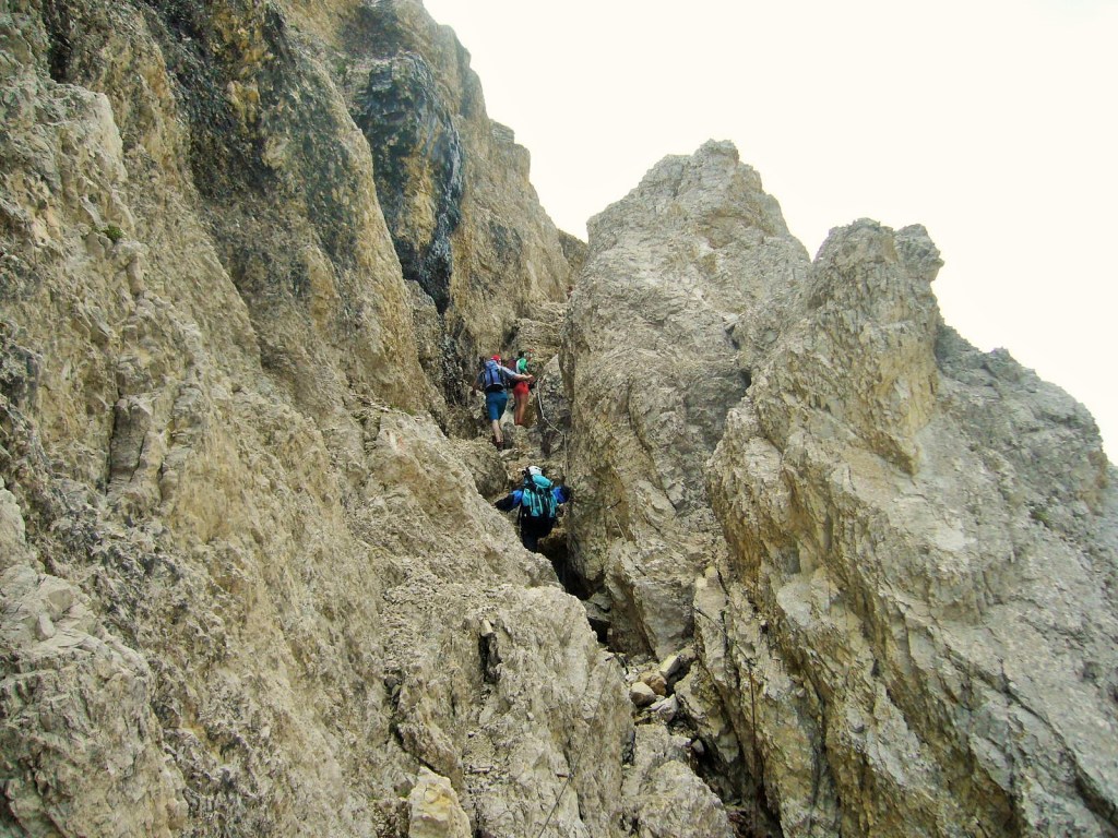 - DIFFICOLTÀ : E+ (per escursionisti/e, con impegno lievemente maggiorato). Giro nel complesso abbastanza impegnativo, per via di lunghezza e dislivelli. Gran parte dell’escursione si svolge per ottimi e comodi sentieri. Un tratto ripido su ghiaione, ottimamente tagliato dalla traccia. Una breve frazione attrezzata dopo il Passo Grande dei Rondoi non deve impensierire: si tratta di risalire un canalino roccioso chiuso e non esposto, sì ripido, anche umido, ma ben appigliato e appoggiato; le funi, ottimamente disposte, ne agevolano la rimonta invitando a una comoda trazione. La gradualità dell’ascesa, la buona qualità del terreno, la brevità dei pochi tratti ripidi favoriscono una fruizione armoniosa dell’escursione, mitigando la fatica nonostante , la lunghezza e i dislivelli importanti.